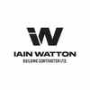 Group of six people in construction site holding a sign, surrounded by scaffolding. The sign reads "Iain Watton Building Contractor Ltd.". The site has unfinished walls and a view of trees and water outside.